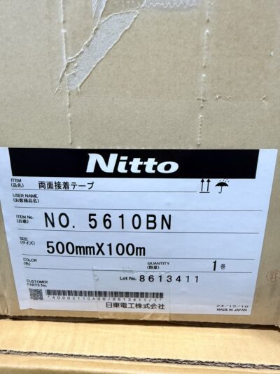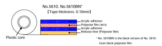 Băng keo Nitto 5610 và No. 5610BN là băng keo hai lớp dày 0,10 mm bao gồm lớp nền màng polyester phủ keo acrylic. Sử dụng lớp lót tách màng polyester và lõi nhựa, là băng keo hai mặt lý tưởng cho các ứng dụng liên kết như các bộ phận ngoại vi của mô-đun đèn nền LCD.