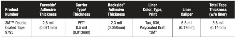 Băng keo hai mặt 3M 9795 với keo dán màng 3M 420 là loại băng keo màng có độ bám dính cao, với lớp màng polyester làm chất nền, giúp tăng độ ổn định về kích thước và cải thiện khả năng thao tác, dễ dàng cắt khuôn và dán màng. Keo acrylic 3M 420 có độ bám dính cao, mang lại hiệu suất cao trong phạm vi nhiệt độ rộng và độ bám dính tuyệt vời với nhiều loại nhựa.